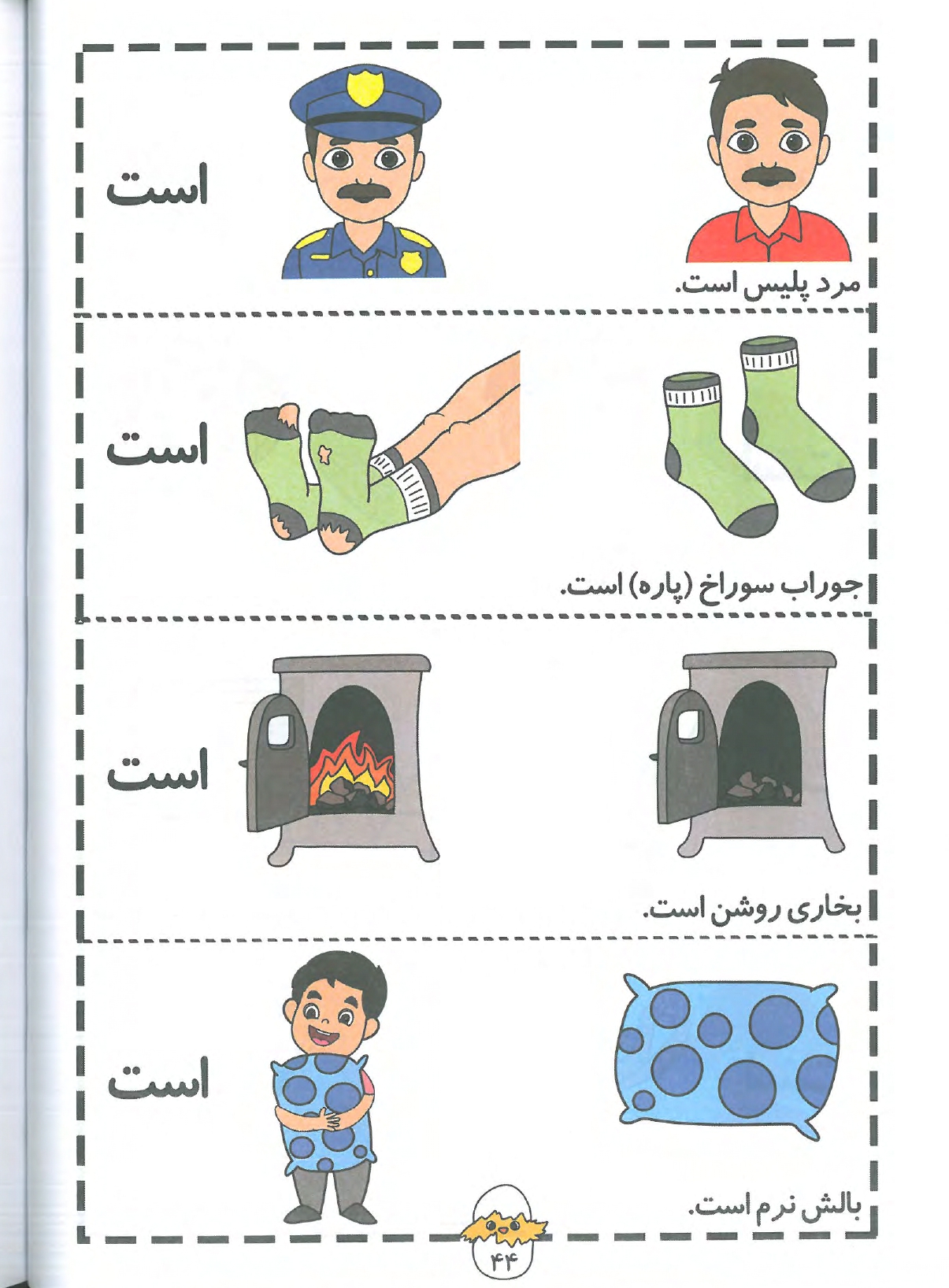 افعال ربطی (مثل "است") معمولاً برای کودکان انتزاعی و سخت هستند. این کتاب با نشان دادن ویژگیهای ملموس (مثل "جوراب سوراخ است" یا "بخاری روشن است") این مفهوم را برای کودک قابل دیدن و درک کردن میکند.