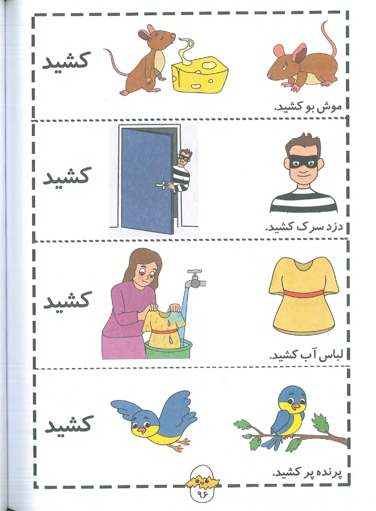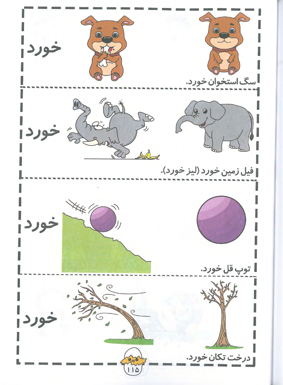 در این بخش، کودک یاد میگیرد که یک فعل چگونه میتواند در موقعیتهای مختلف معانی متفاوتی داشته باشد. تصویرسازیهای کارتونی و بامزه (مثل فیلی که لیز خورده) باعث میشود این مفاهیم در ذهن کودک حک شود.