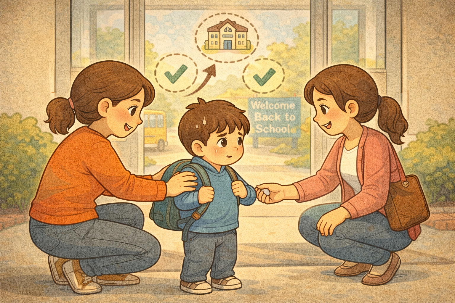 با مدیر/معلم هماهنگ کنید که استقبال کوتاه و آرام باشد، کودک لازم نباشد همان روز اول در مرکز توجه قرار بگیرد، و اگر نگرانی اجتماعی دارد یک “پناه امن” داشته باشد (مثلاً یک بزرگسال مشخص که چند دقیقه اول حضور همراهی کند).
