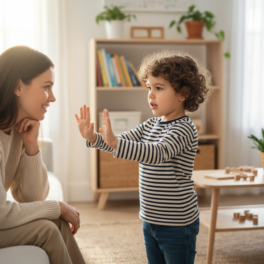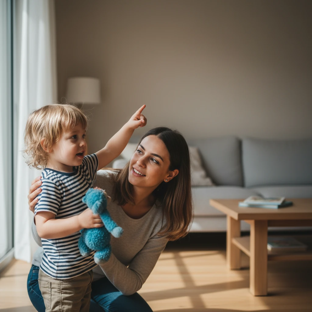 بهتر است والد جمله را کامل بگوید و سپس اجازه دهد کودک بخشهایی از آن را تقلید کند. هدف، شنیدن الگوی درست جمله است، نه تصحیح مداوم یا فشار برای گفتن.