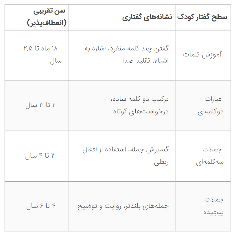 جدول سطوح گفتار کودک